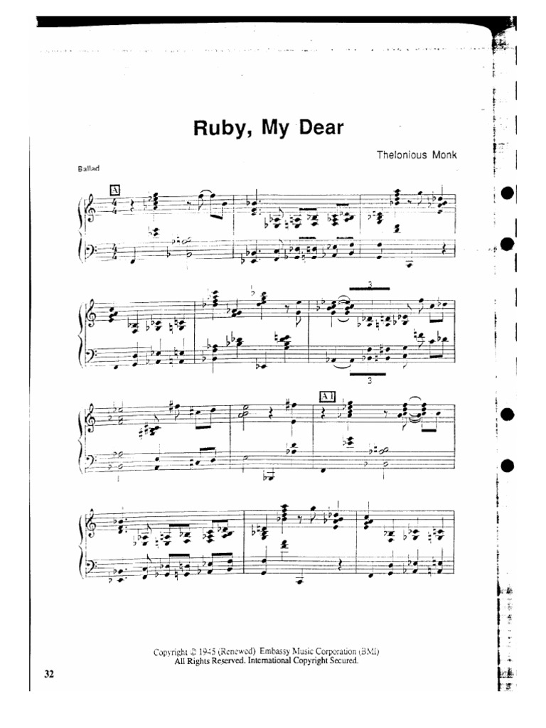 Print and download ruby my dear sheet music by thelonious monk arranged for piano.